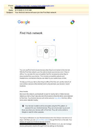 Google has added some Android devices to their "Find Hub" network without the users consent, only informing them via email, and giving only 2 days to opt-out. There is supposedly an opt-out link, but…