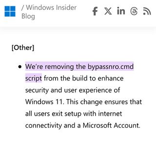 In a Windows insider blog published March 28, 2025, under the section "[other] changes", the removal of bypassnro.cmd script is announced. This script is used to complete a new Windows installation…