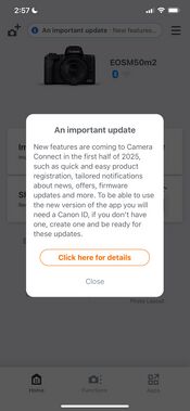 In early 2025, the Camera Connect app began to warn users that it would require an online account (Canon ID) in the first half of 2025.[8] The alert read: