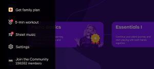 The Simply Piano app with the administrative drop-down menu opened and scrolled to reveal the settings option.