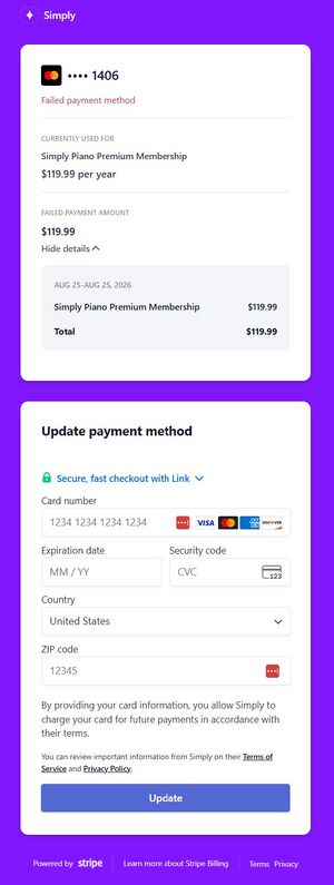 Email Simply sends to users whose payment information has failed. The only options are to update payment information or send the company an email.