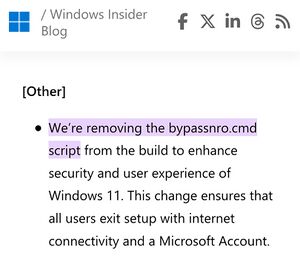 In a Windows insider blog published March 28, 2025, under the section "[other] changes", the removal of bypassnro.cmd script is announced.[1] This script is used to complete a new Windows installation without connecting to the internet or creating a Microsoft account.[2]