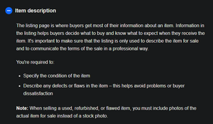 The listing page is where buyers get most of their information about an item. Information in the listing helps buyers decide what to buy and know what to expect when they receive the item. It's important to make sure that the listing is only used to describe the item for sale and to communicate the terms of the sale in a professional way.