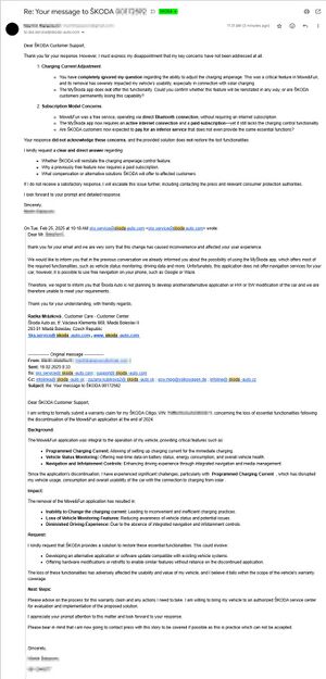 Since August 2025, MySkoda has not functioned for MOD1 and MOD2 vehicles. Skoda customer support confirmed in an email to an affected owner: "the issue you are experiencing is related to your vehicle, which affects all remote services for MOD1 and MOD2 vehicles."[10]
