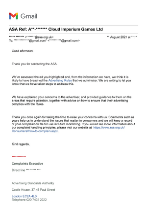 In 2021, following a consumer complaint to the UK Advertising Standards Authority (ASA) by a member of the /r/starcitizen_refunds community, Cloud Imperium Games was required to modify its concept ship marketing emails after the ASA determined that they violated UK advertising rules[13], Cloud Imperium Games was needed to alter its concept ship marketing emails after the ASA determined they violated Advertising Rules in the UK. The issue centered on emails promoting concept ships without clear disclosure that the advertised vessels did not yet exist in the game. In response, CIG added a standardized disclaimer to their marketing emails stating that concept ships are "being offered here as a limited vehicle concept pledge". The disclaimer also notes that purchasers receive a temporary "loaner vehicle" until their bought ship becomes available.