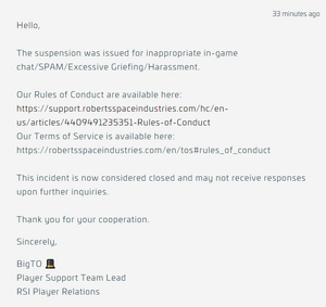 - ↑ @Thrysurr-CIG. "Rules of Conduct". Roberts Space Industries. Archived from the original on 2025-10-23.